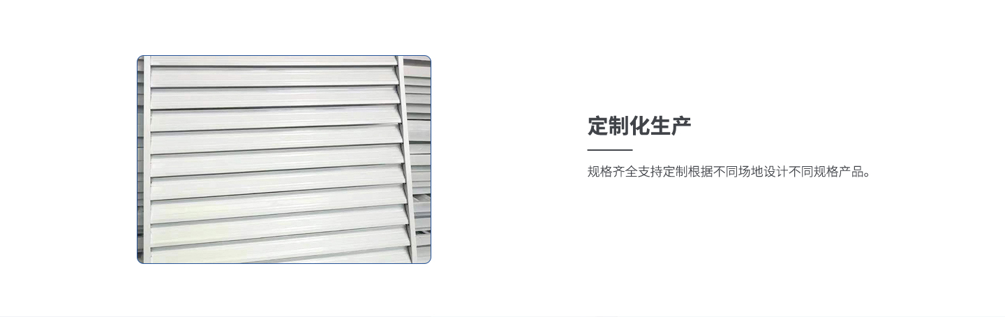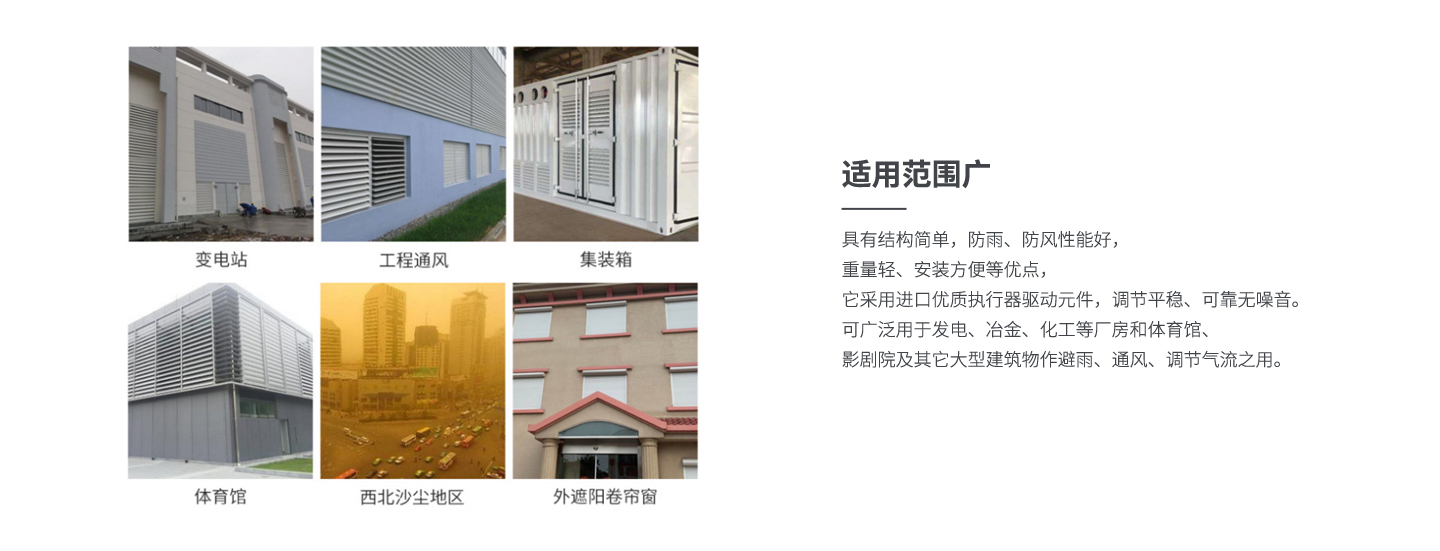 該百葉窗具有結(jié)構(gòu)簡單,防雨、防風性能好,重量輕、安裝方便等優(yōu)點, 它采用進口優(yōu)質(zhì)執(zhí)行器驅(qū)動元件,調(diào)節(jié)平穩(wěn)、可靠無噪音。 可廣泛用于發(fā)電、冶金、化工等廠房和體育館、影劇院 及其它大型建筑物作避雨、通風、調(diào)節(jié)氣流之用。